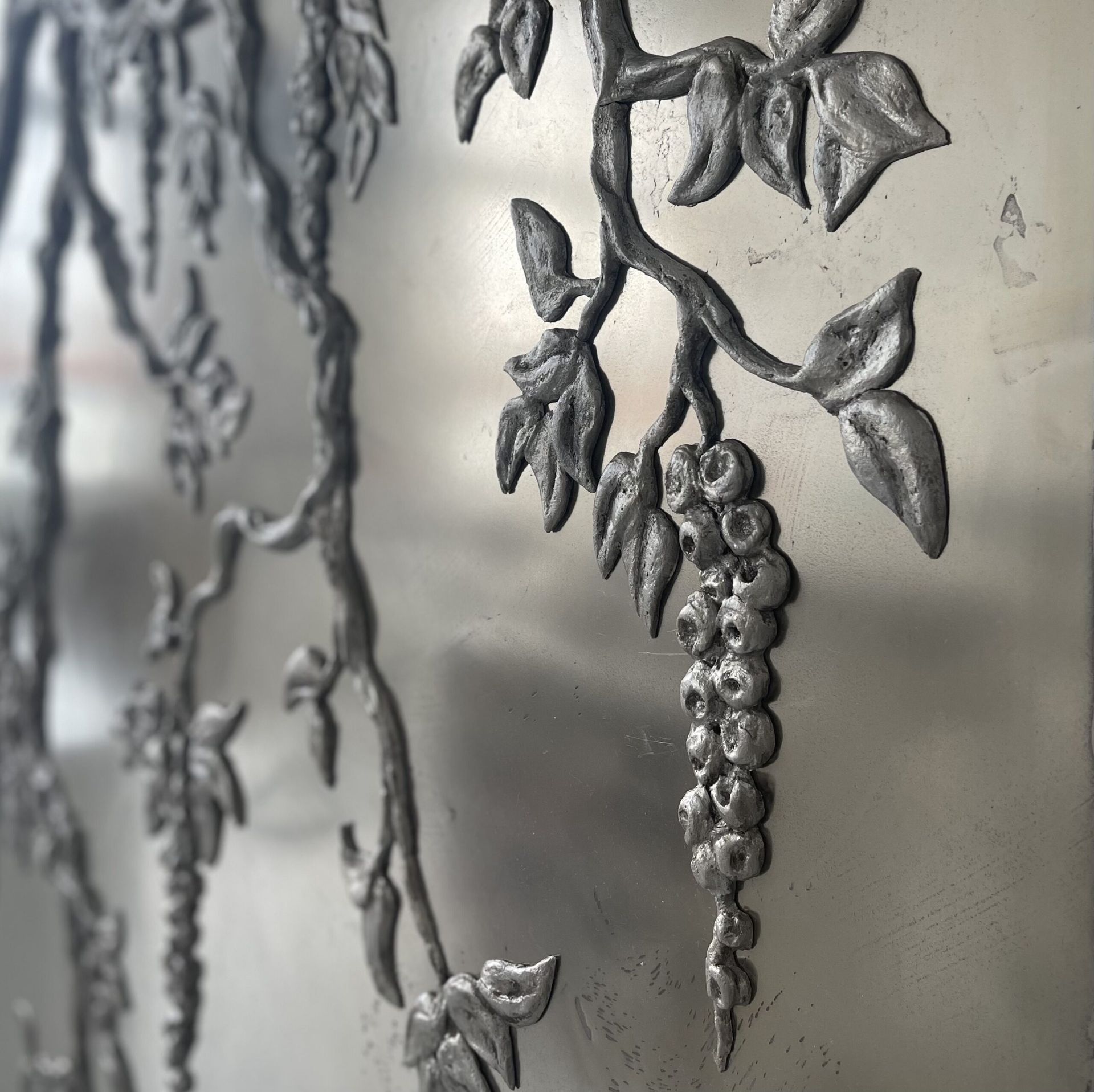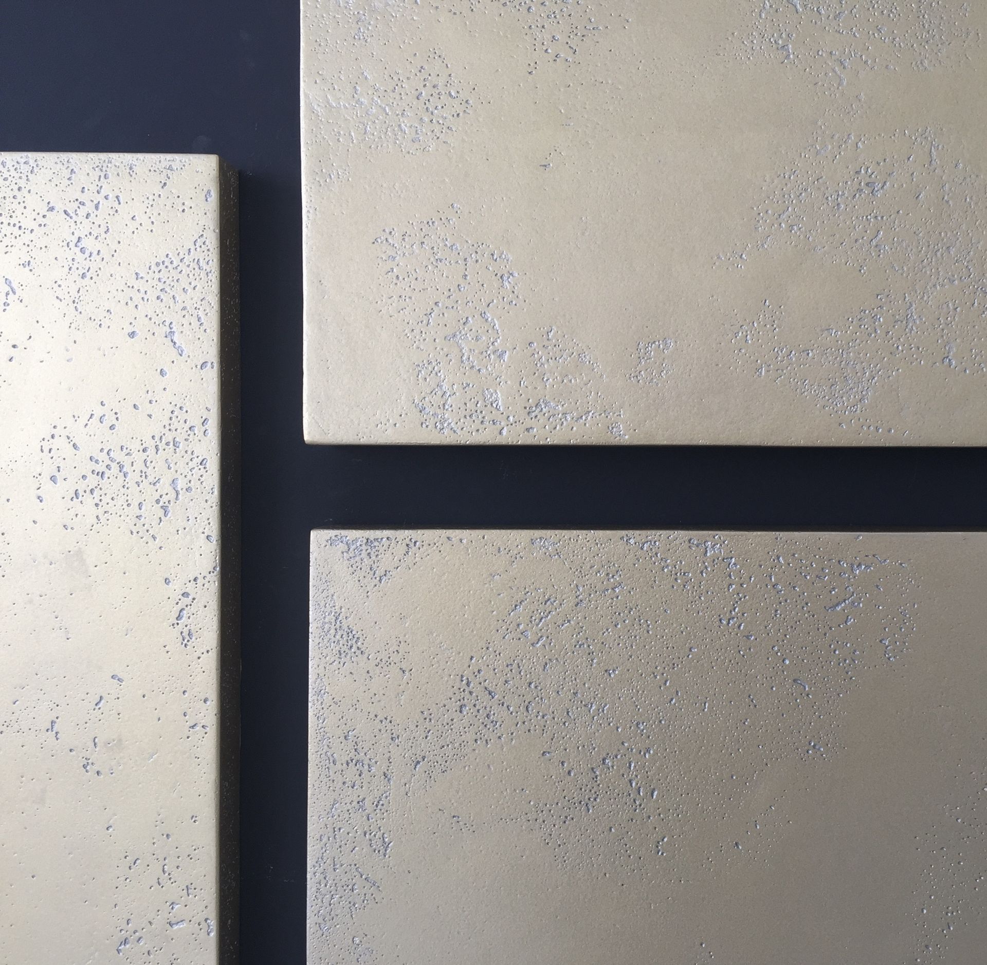 Löst man sich von dieser Darstellung und bricht das Erscheinungsbild dieser feinen Materialien durch einen gestalteten Untergrund oder Überlagerungen verschiedener Bronzen, entstehen Oberflächen mit einer zurückhaltenden aber dennoch wertvollen Eleganz.